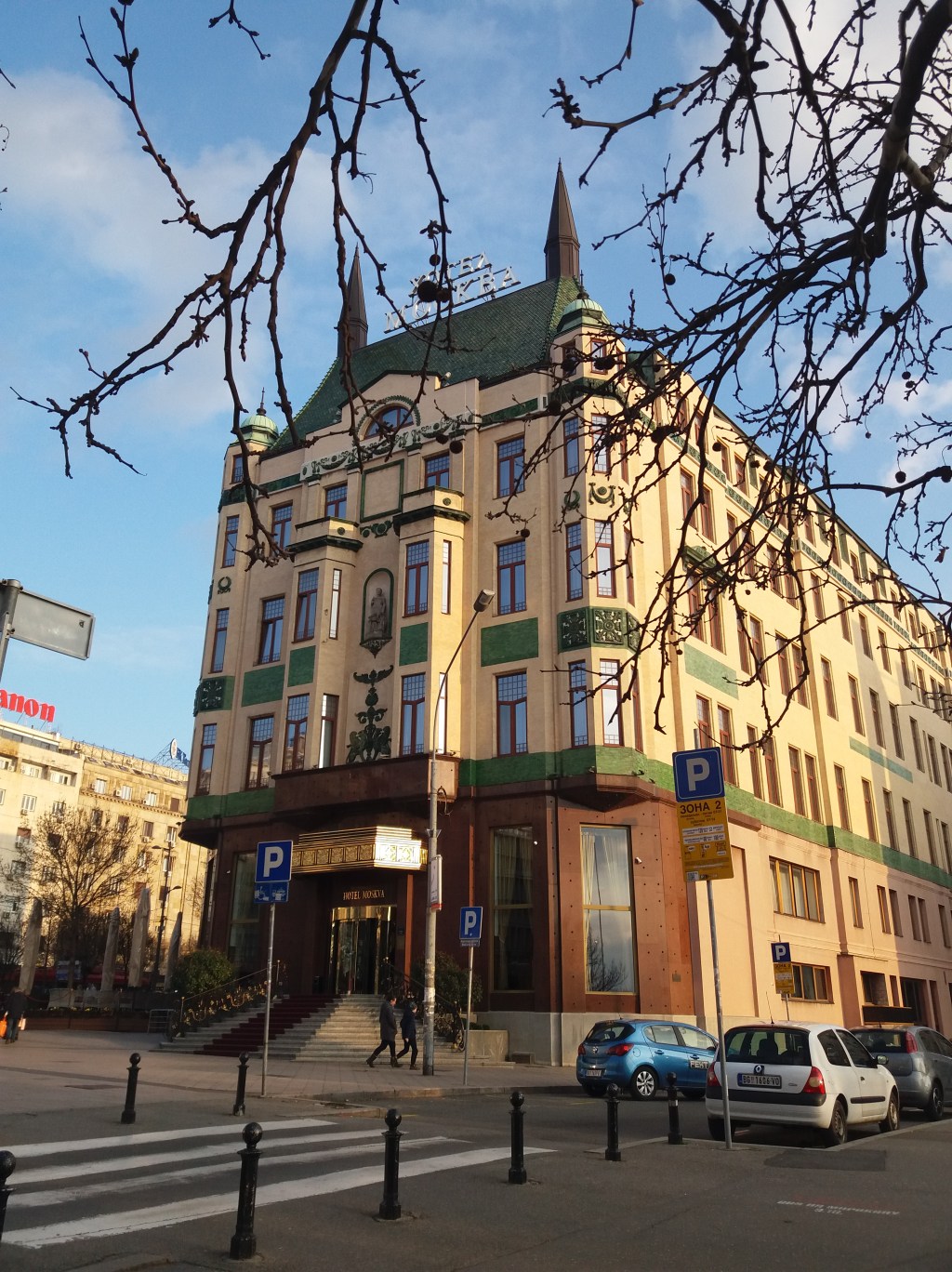 Önde yaya geçidi olan yolun arkasında görkemli, büyük ve tarihi bir yapı duruyor. Hotelin yan yolunda park levhaları ve park etmiş araçlar var. Dış cephesi oldukça gösterişli; üzerinde heykeller olan, yeşil desenlerle bezenmiş, geneli sarı renkte, bol pencereli…Altın renkli giriş kapısına bol merdivenlerden, bordo halı üzerinden geçerek ulaşılabiliyor. Dönen bu kapı, gelecek misafirlerini karşılamaya hazır, aralık olarak bekliyor. Hotelin solunda büyük binalar ve ağaç; sağ çaprazında ön cephesine doğru eğilmiş kuru ağaç dalları sarkarak bir tabloyu tamamlıyor gibi duruyor. Çatısında iki sivri minare görünümünde yapı dikkat çekiyor. Bunların arasında Slav dilinde hotelin adı yazıyor. Hotel tarihi yapısı ve görünümüyle misafirlerine davetkar görünümde.