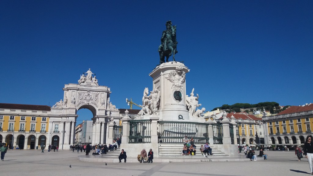 Portekiz dilinde Praça do Comercio, ticaret meydanı denilen bu alan; ülkenin dünyaya açılan bir kapısı. Meydanın tam ortasında Kral I. José’nin yılanları yani kötülüğü ezen bir atın üstünde olduğu, muhteşem bir heykeli var. Etrafını kralı korumayı amaçlayan kanatlı koruyucu melek heykelleri ve koyu yeşil çitler çevreliyor. Çitlerin dışında insanların oturduğu merdivenler yer alıyor. Heykelin arkasında meydana açılan gösterişli anıt kemer ve içinden geçen insan kalabalığı dikkat çekiyor. Büyük kapı izlenimi oluşturan kemer, iki yanındaki sütunların üzerinde duran heykellerle şehre gelenleri adeta selamlıyor. Arkada bol pencereli sarı binaların sağ üst köşesinde brokoliye benzeyen ağaçlar uzanıyor. Fotoğrafın üst yarısını koyu gökyüzü kaplıyor. Mavinin keskin görünümü kralın asaletini perçinleyerek, şehre gelenlerin kontrollü geçişini sağlıyor.