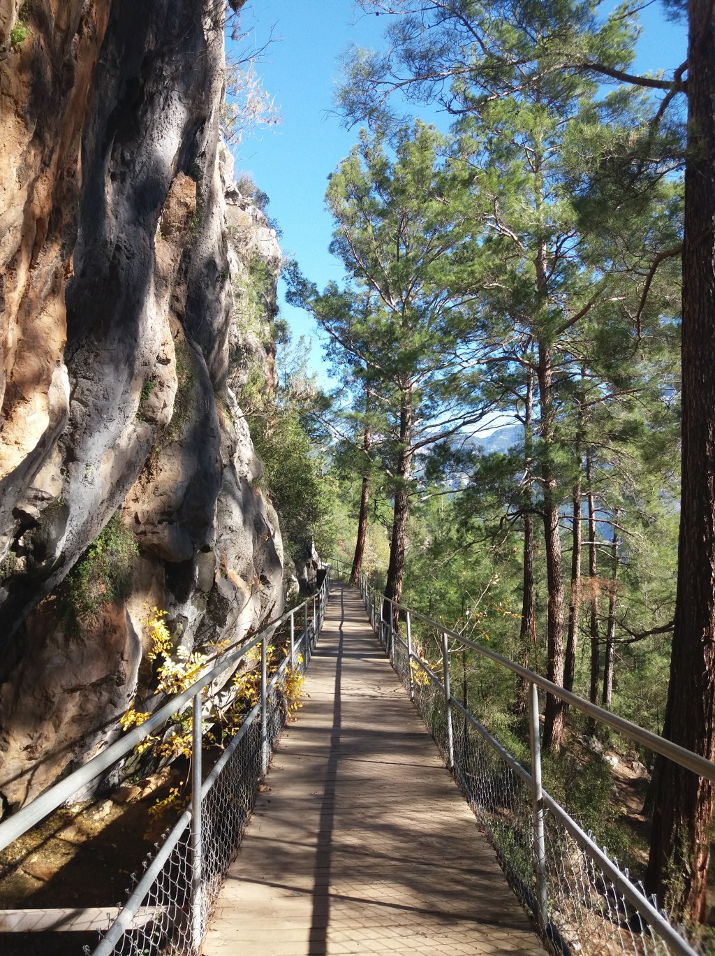 Manzaranın merkezinde; ahşaptan yapılmış bir yürüyüş yolu, ileriye doğru perspektif oluşturarak uzayıp gidiyor. Kenarında yürüyüş rotasını sınırlayan ve rehberlik eden demir korkuluklar var. Alt kısmı tel örgülü, üst kısmı boş dikdörtgen şeklinde bölünmüş. Korkulukların üst kısmının yansıyan görüntüsü, yolun ortasında bir çizgi çizerek ilerliyor. Sağda ince, cılız çam ağaçlarının yeşilliği ortama doğal bir hava katıyor. İleride ağaçların arasından belli belirsiz sıradağlar uzanıyor. Solda kalın ağaç gövdelerinin görüntüsünü andıran, iri iri kayaçlar var. Üstte masmavi, ışıl ışıl bir gökyüzü, güneşin tam tepede olduğu öğle vaktini işaret ediyor. Burası “Cüceler Mağarası”na giden huzur dolu, gizemli bir yol.