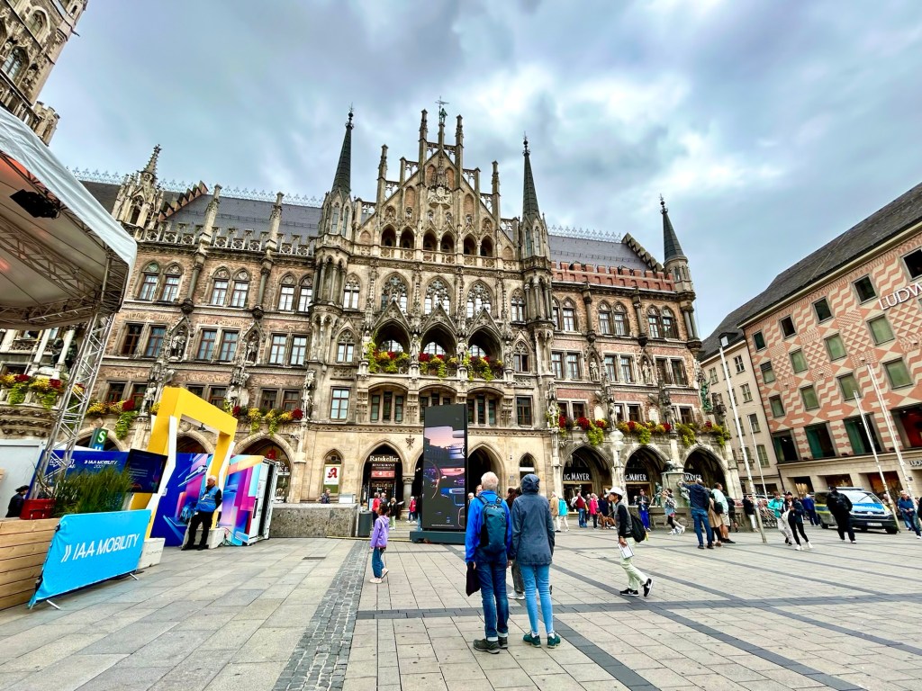 Fotoğrafta gri gökyüzünün altında; gotik mimarili, tarihi, büyük bir belediye binası ve geniş bir şehir meydanı öne çıkıyor. Binanın cephesinde ince oymalar, sivri kuleler ve rengârenk çiçeklerle süslenmiş balkonlar var. Ayrıca giriş kısmında kemerli arkadlar yer alıyor. İhtişamlı cephesi, görkemli balkonları ve taş oyma heykellerle süslü pencereleriyle bu yapı, Münih’in asırlık hikâyelerini fısıldıyor gibi duruyor. Öndeki meydanın kare şeklindeki taş döşemeleri yerde boylu boyunca uzanıyor. Burada gruplar hâlinde etrafı izleyen, fotoğraf çeken insanlar var. Tam ortada lacivert renkli montlarıyla bir çift, arkası dönük heykel gibi durmuş, tarihi yapıya ve kulelere bakıyor. Meydanın solunda modern bir fuar alanı kurulmuş. Burada “IAA Mobility” yazılı hareketli stantlar ve panolar bulunuyor. Sağda ise cephesinde dalga desenli motifler olan başka bir bina, adeta şehir hayatının tarihi yapıyla iç içe geçtiği bir sahne oluşturuyor. Genel olarak turistik, hareketli, tarihi ve modern unsurların bir arada bulunduğu bu meydan, özellikle kuleleriyle gezginlerin hafızalarında yer etmeyi amaçlıyor.